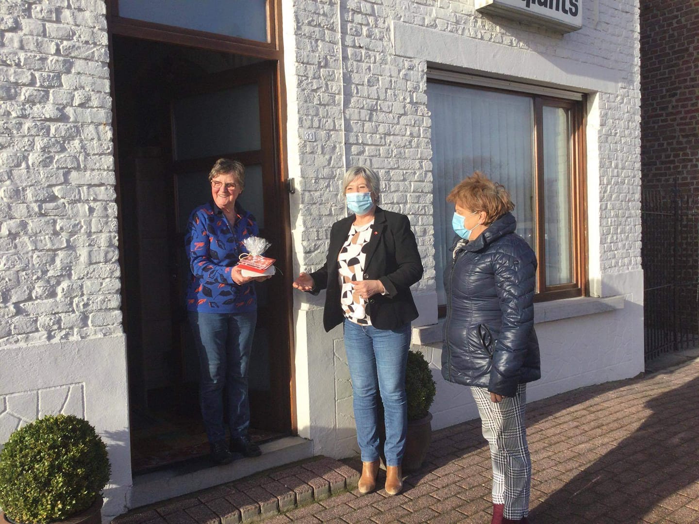 Burgemeester Greet De Roo en Schepen van sociale zaken Linda Wyckstandt brengen de genomineerde vrijwilligers een geschenk. Op deze foto zie je hoe Antoinette Van Colen een attentie krijgt omdat ze jarenlang mantelzorger was van haar hoogbejaarde buurvrouw.